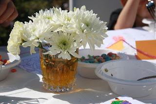 RAINBOW Flower Glasses For these, I had actually gotten mums and daisies that I had attempted to "color" with food coloring, but didn't realize this was not as easy as I thought. Since the color didn't soak up the stems and into the leaves like I hoped it would (or as quickly), I cut the stems down and put the flowers in pretty glasses of rainbow colored water. They were beautiful on the tables...